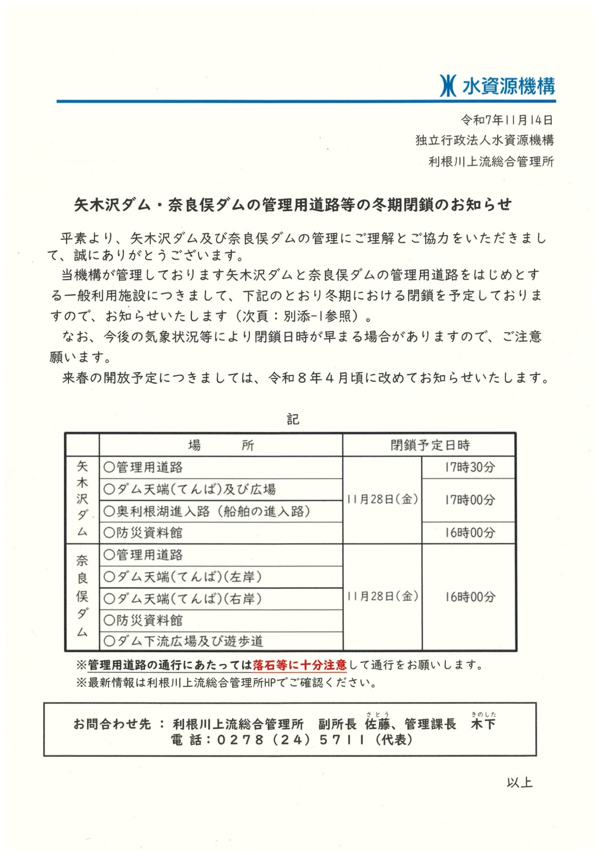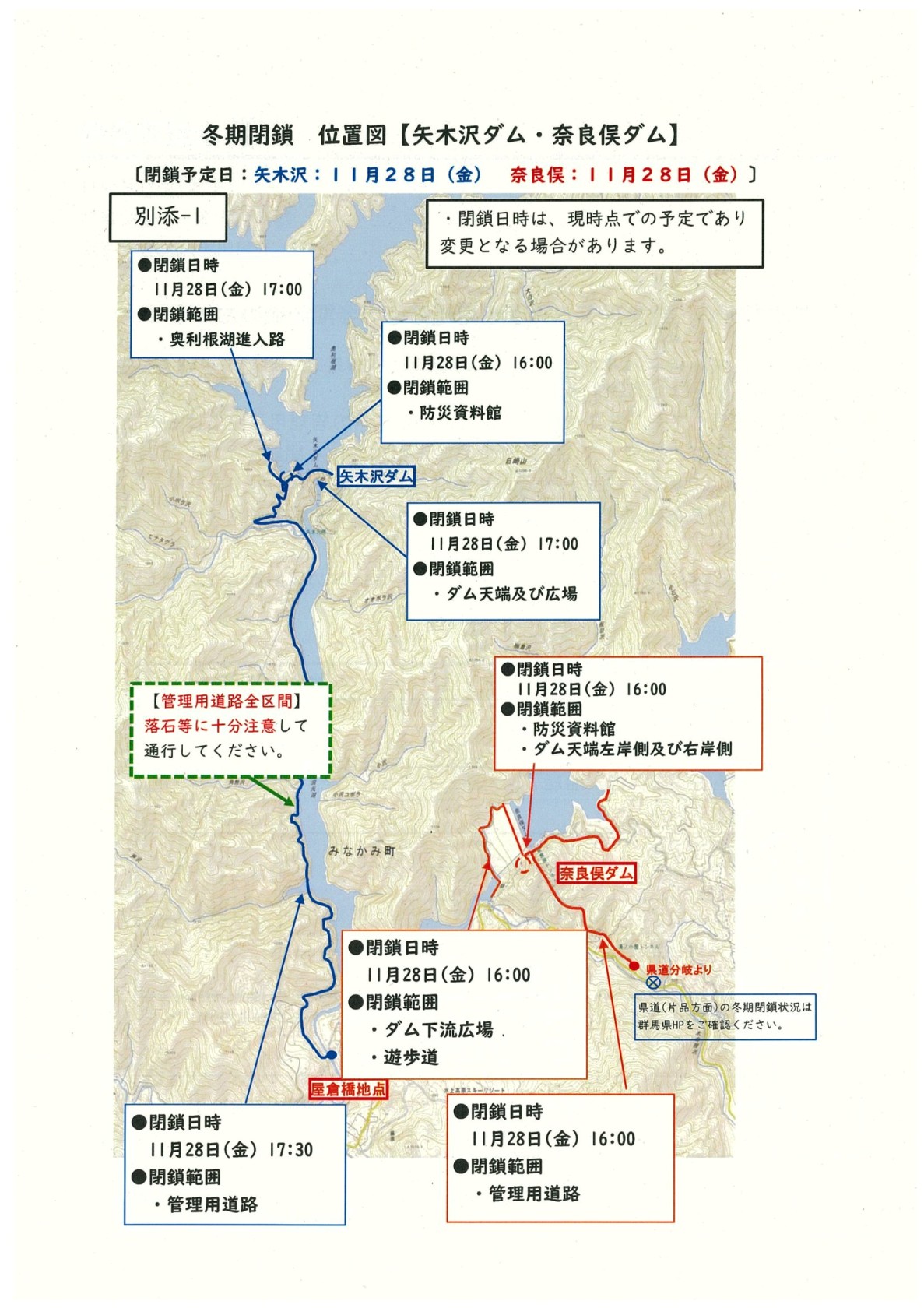 と 奈 良 俣 ダ ム で は 、 冬 期 期 間 の 雪 崩 の 危 険 な ど か ら 矢 木 沢 ダ ム と 奈 良俣 ダ ム へ の 道 路 ( 管 理 用 道 路 ) や 一 般 利 用 施 設 ( 奥 利 根 湖 進 入 路 な ど )の 閉 鎖 を 下 記 の と お り 行 い ま す 。